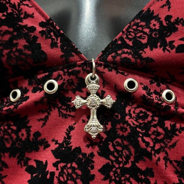 Confeccionado en punto roma, con detalle de ojalillos y cruz bajo el busto. Tiene tiras para atar en el cuello y espalda.